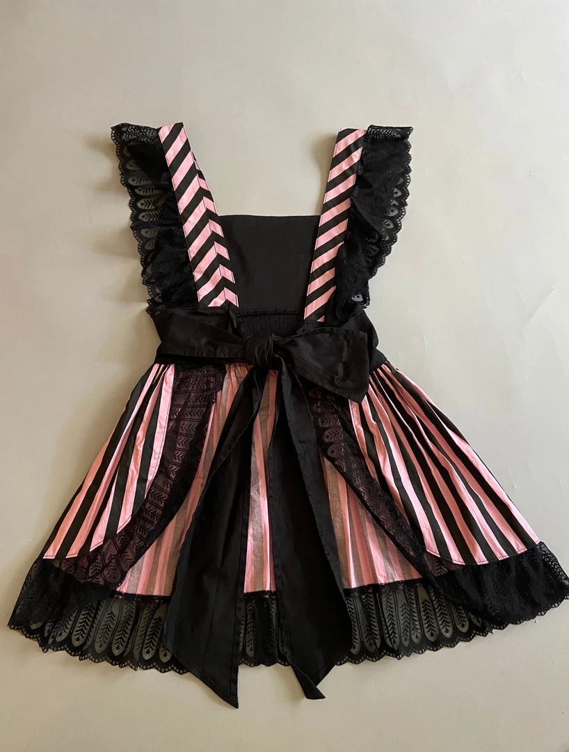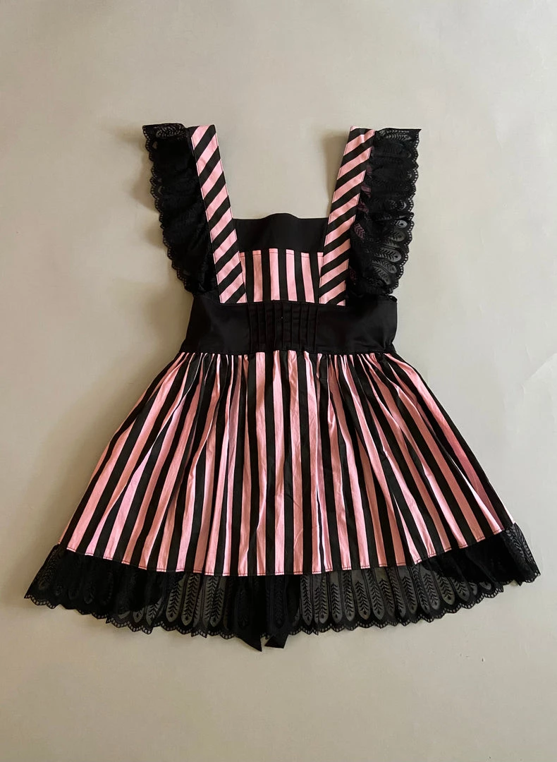 Blacklist Black and Pink Striped Apron. Black Lace Trim. Adjustable Tie Back.