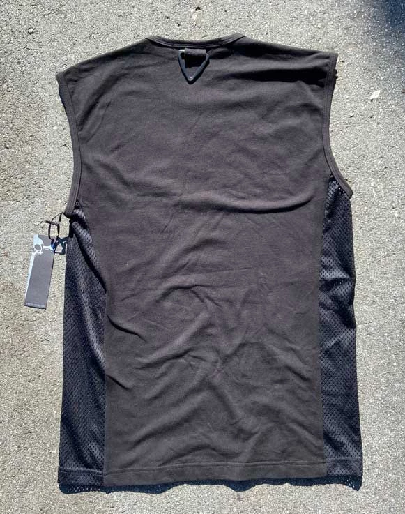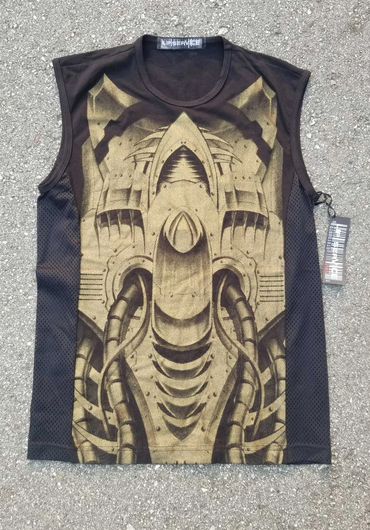 Mens sleeveless top Bio Mechanics sample never worn Gold Metallic Ink w/ mesh side panels. NWT.