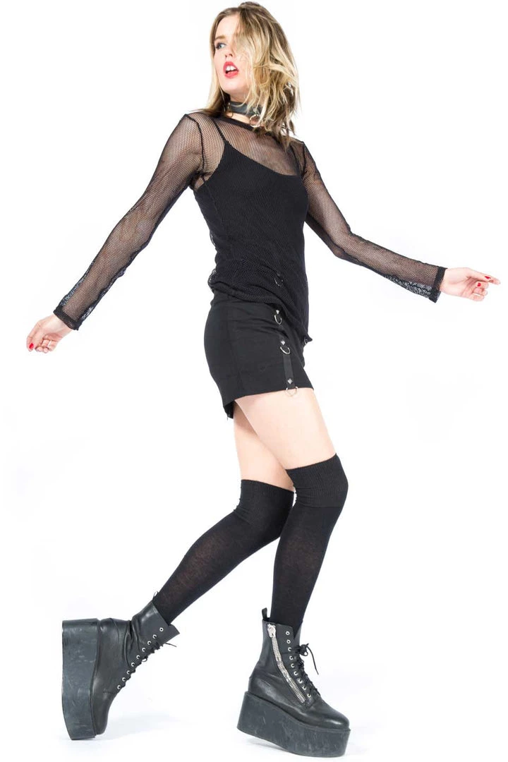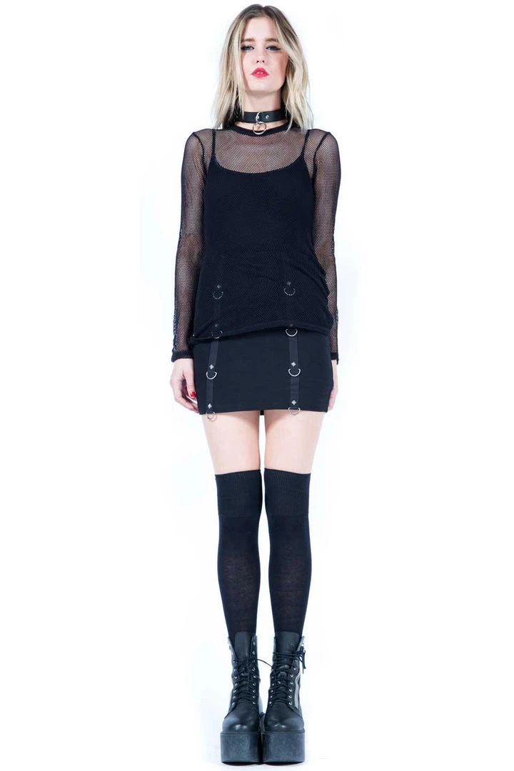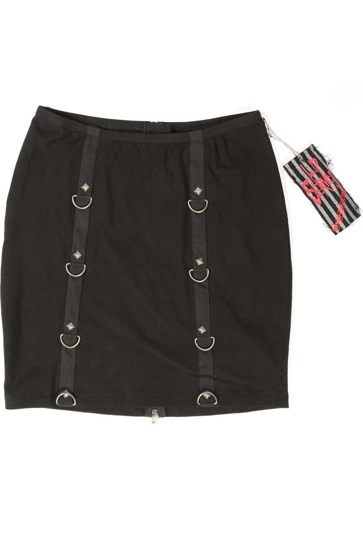 “Batz and Bones” by Lip Service. Cotton / Spandex pencil skirt with zip back and D-Ring details down the front!! Circa 2010 Size M Waist 26″