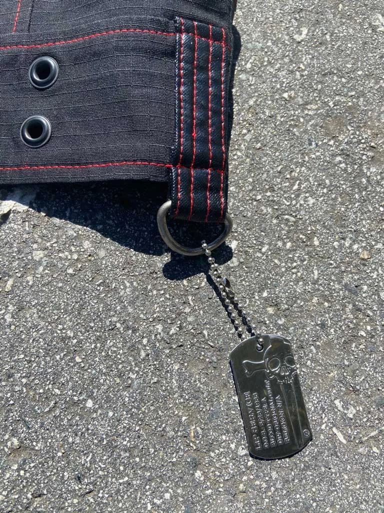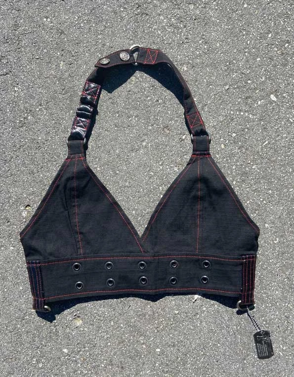 Ladies Military style halter top from “Fallout” collection Mall goth vibes, black nylon fabric w/ red topstitch