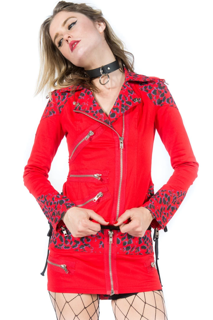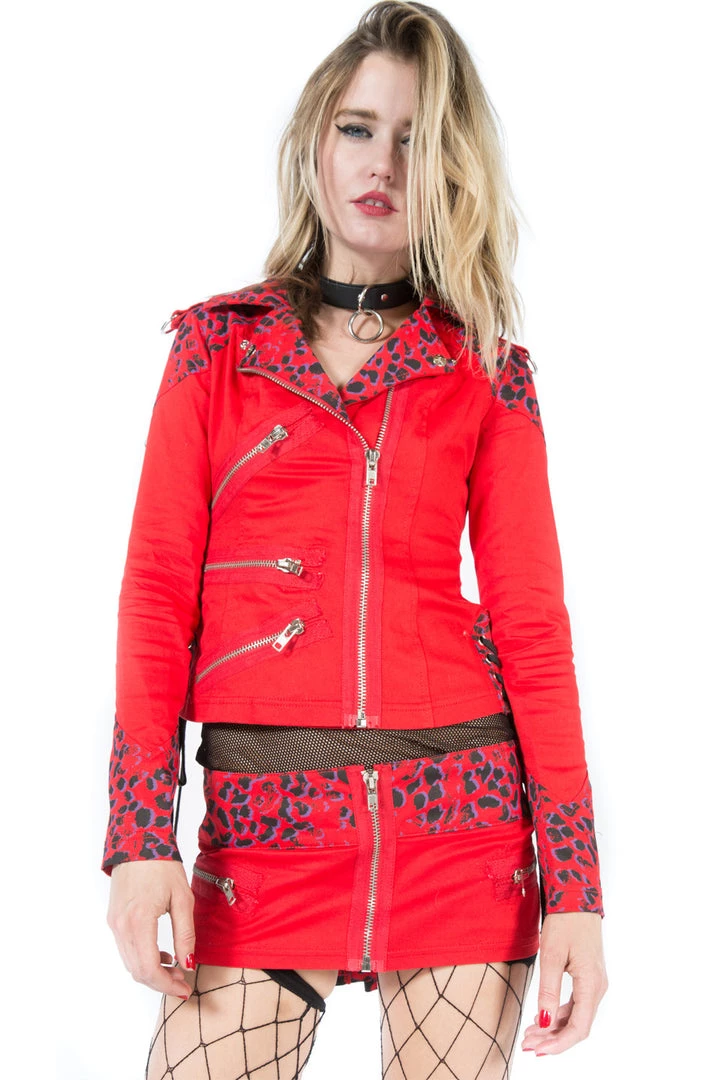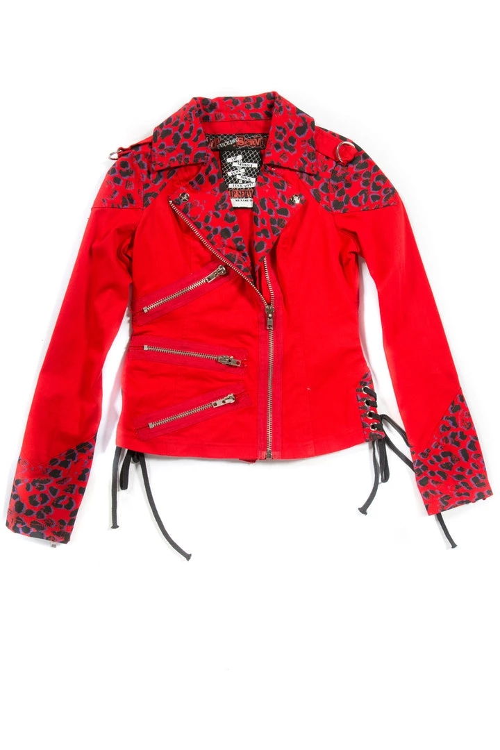 Vintage “Chained to the Radiator” Classic Moto Jacket…. circa 2010 . Stretch light weight twill, with printed leopard contrast , zips and lace up details!! Punk Rock AF….