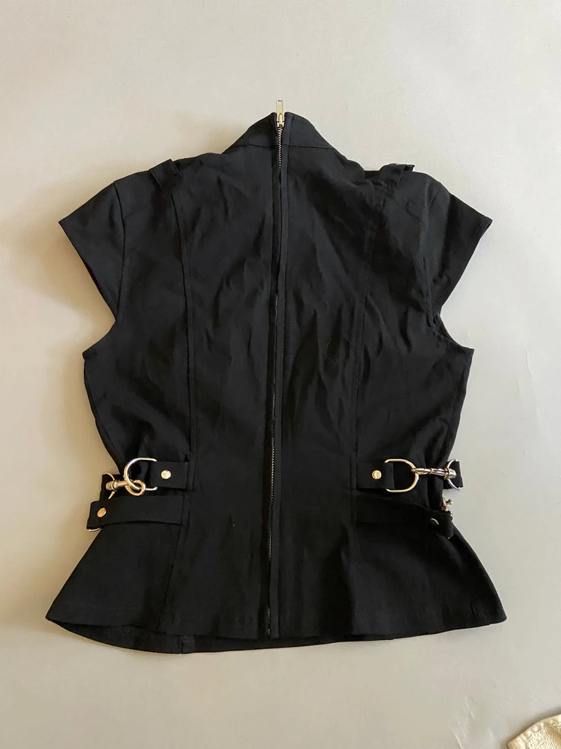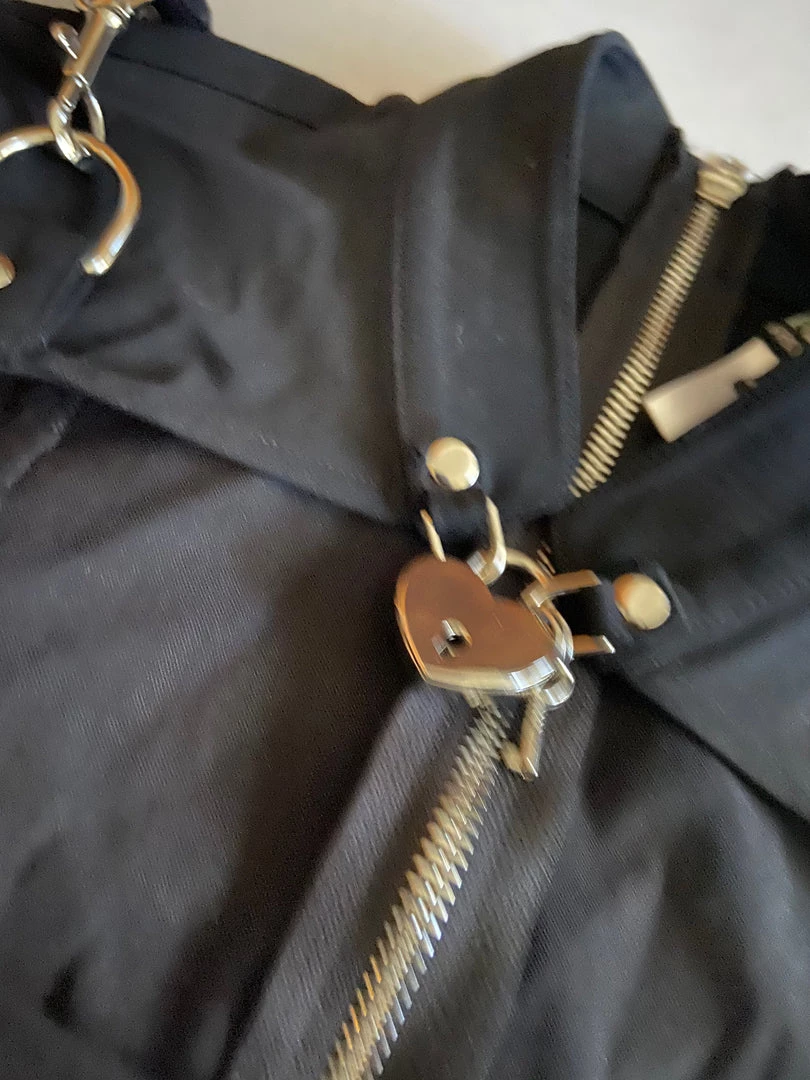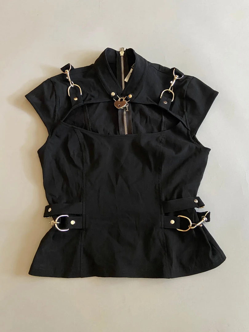 Solid Black Bangalein Gansta Pranksta Bondage Top. Heart Lock at Collar. Silver Hardware. Back Zip. No Style #. Small. Chest 32″