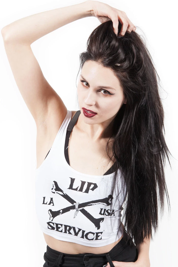 Lip Service Cross Bones LA print women’s crop tank…This crop top is perfect for your gothletic moments!! Print is on the front only.
