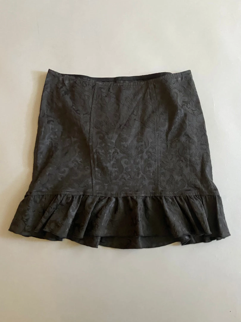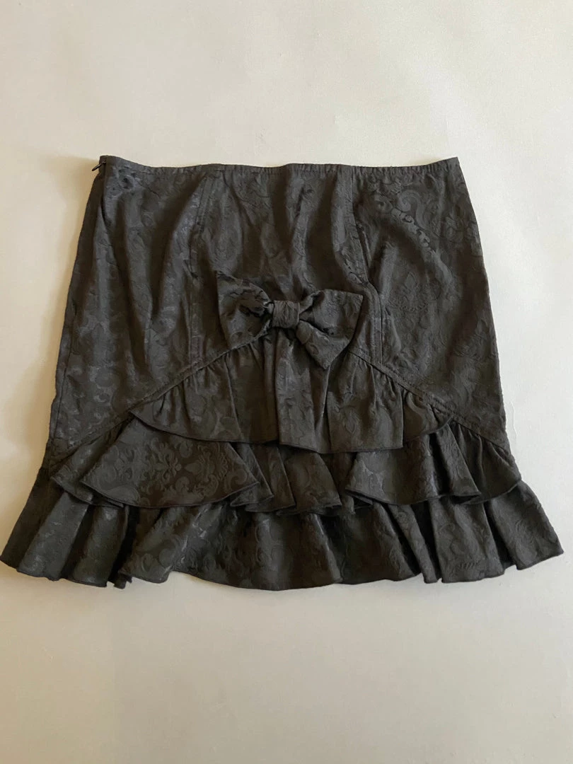 Blacklist Black on Black Brocade Fabric skirt . Button Ruffle Front. Black Bow in back with additional ruffle accent. Side Zip. Size M. Waist 30″ Length 15 ” Style #53-49