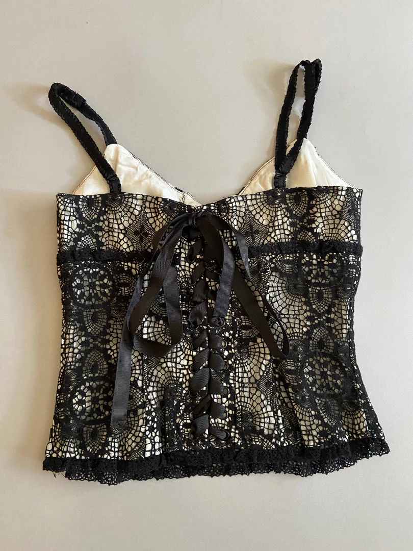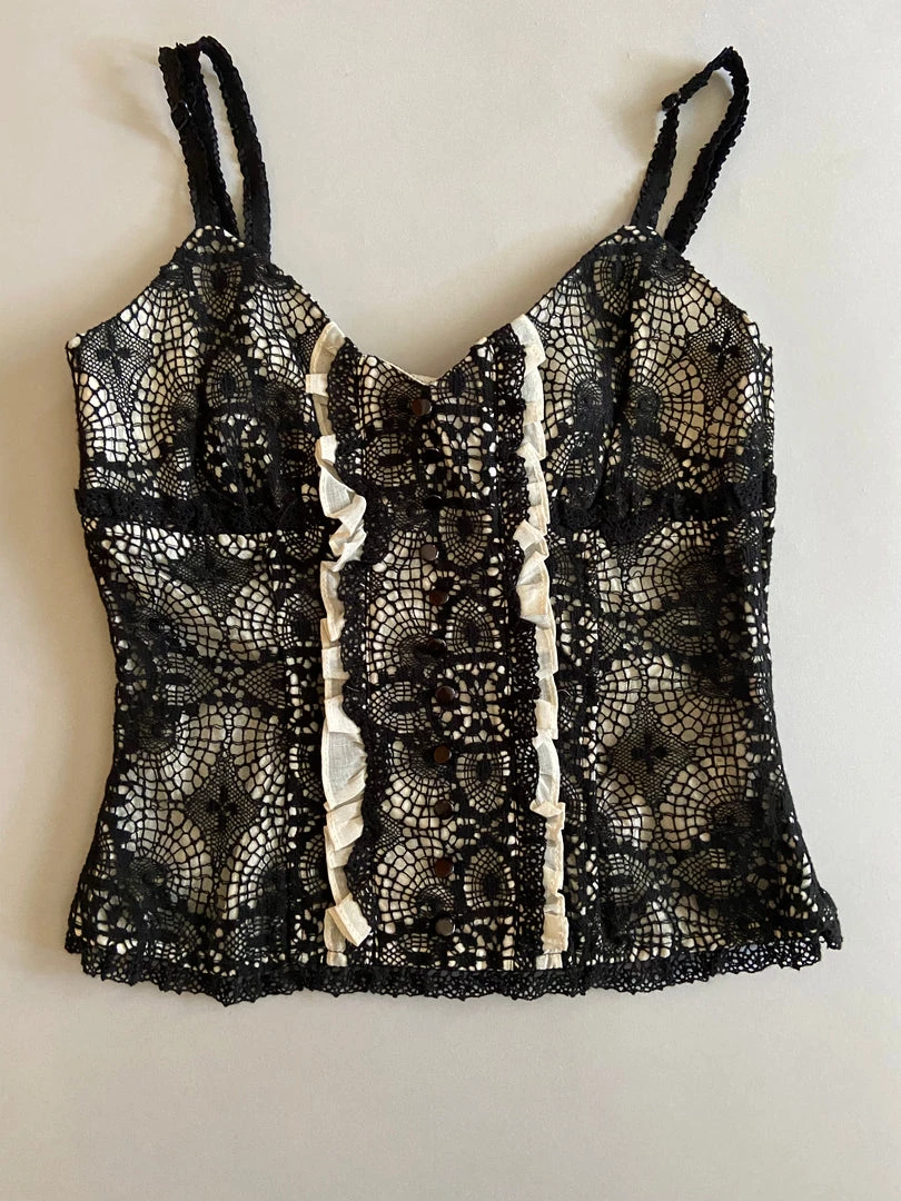 Black Crochet Lace Tank Top with White Ruffle Accent. Black Ruffle Elastic Bra Strap. Black Ribbon Lace Up Back. Blacklist. Size M. Chest 28″ Length 11″ Style # 25-68