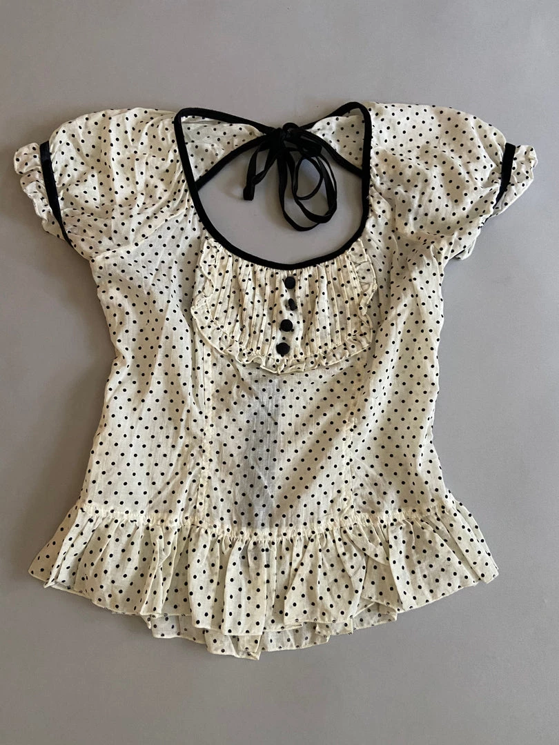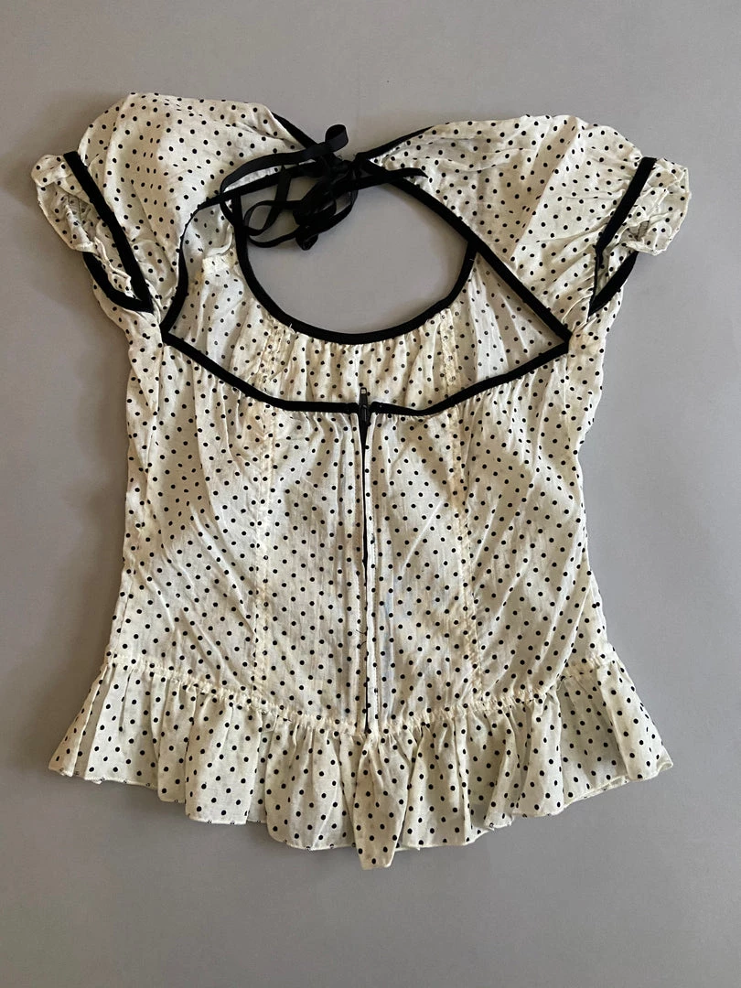 Ladies White Cap Sleeve Cotton Blouse with Black Polka Dot Print. Ruffle at Chest. Black Velvet Buttons at Chest. Black lace Acccent on front and back. Zipper back. STYLE #29-138