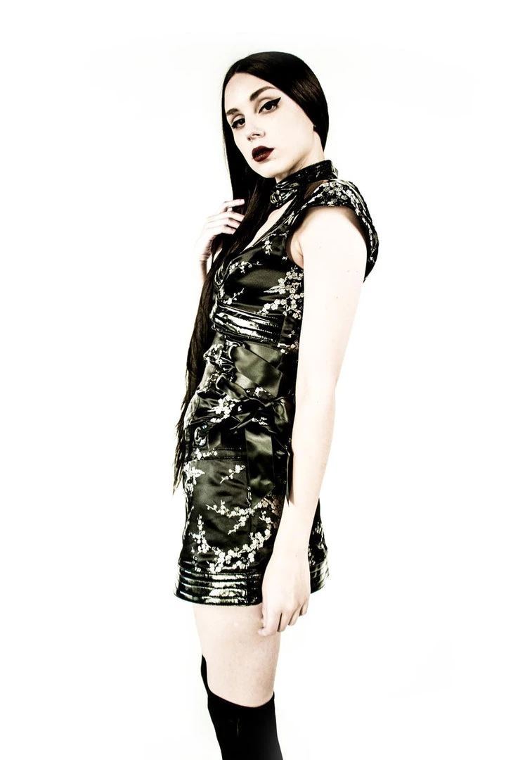 Vintage Lip Service ‘Tokyo Trix’ Brocade Black & Silver Mini Skirt. This Skirt Sits Low On the Waist & Has Side Tie Details & PVC Trim. If You Love this Skirt There Is a Matching Top & Jacket to Complete the Look!