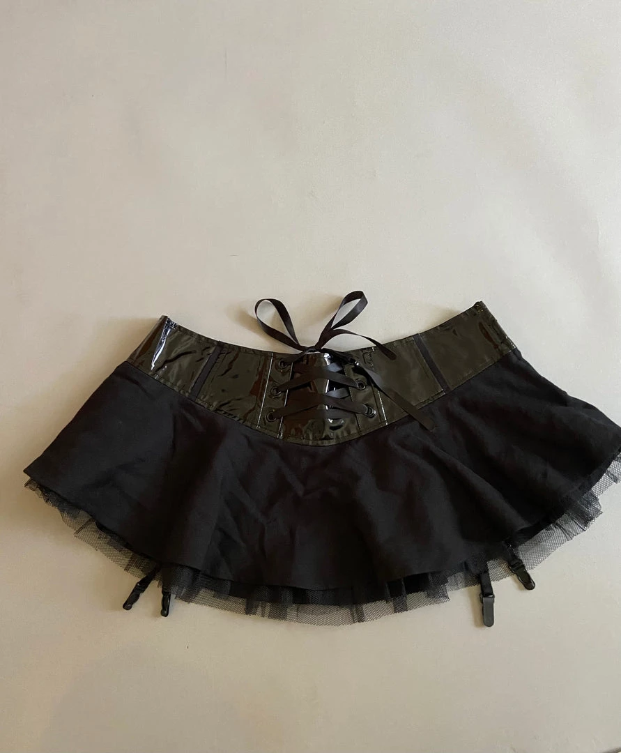 Black Low Rider Garter Suspender Micro Mini. Blk PVC with ribbon tie accent in front and back. Black twill with mesh ruffle and garter suspender. Size S. Hip 30″