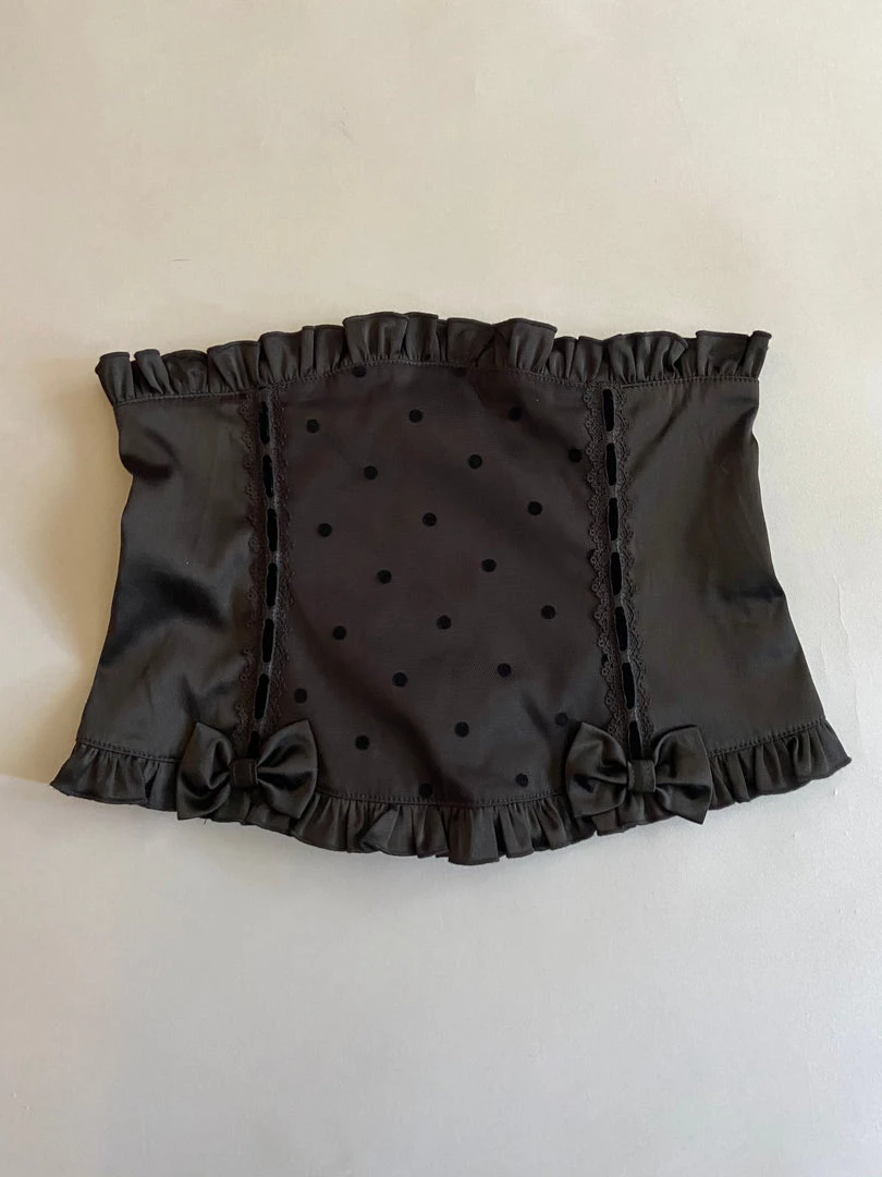 Blacklist Black Stretch Satin Cincher with Swiss Polka Dot. Velvet Detail. Lace Up Adjustable Back.