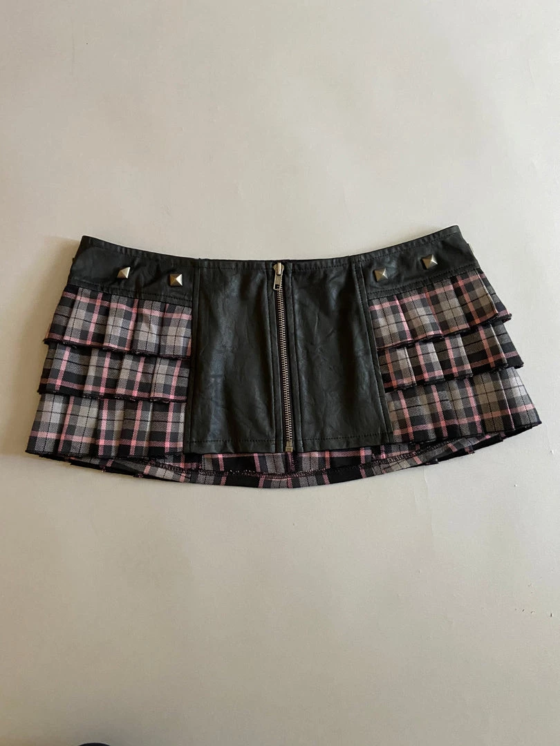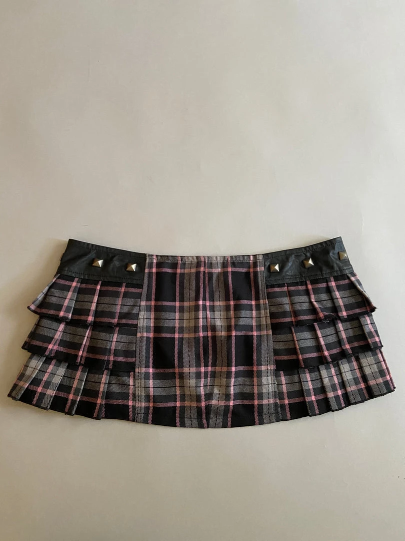 Coated Blk and Pink Plaid Pleated Hem Micro Mini. Pyramid Stud waist detail.